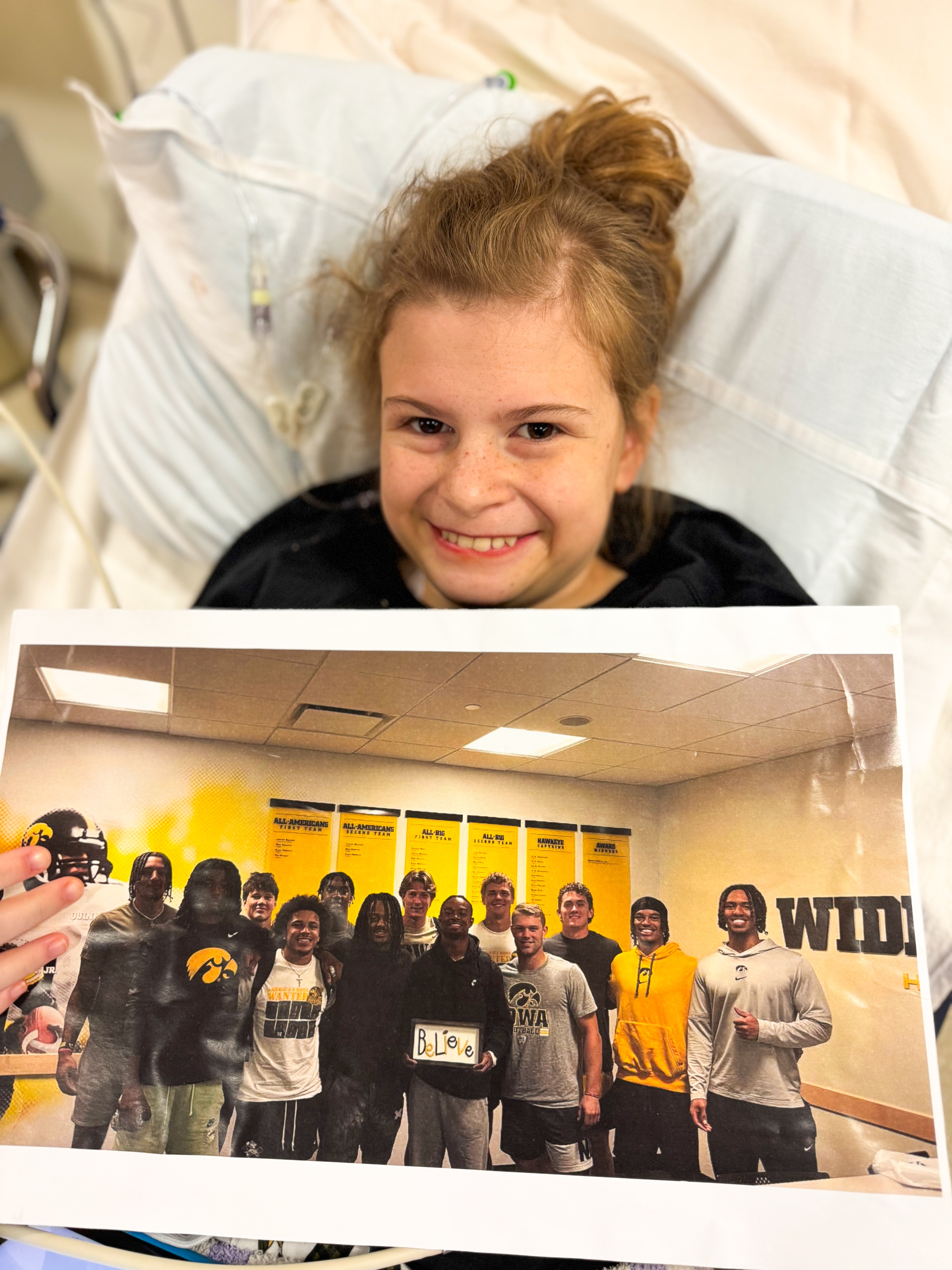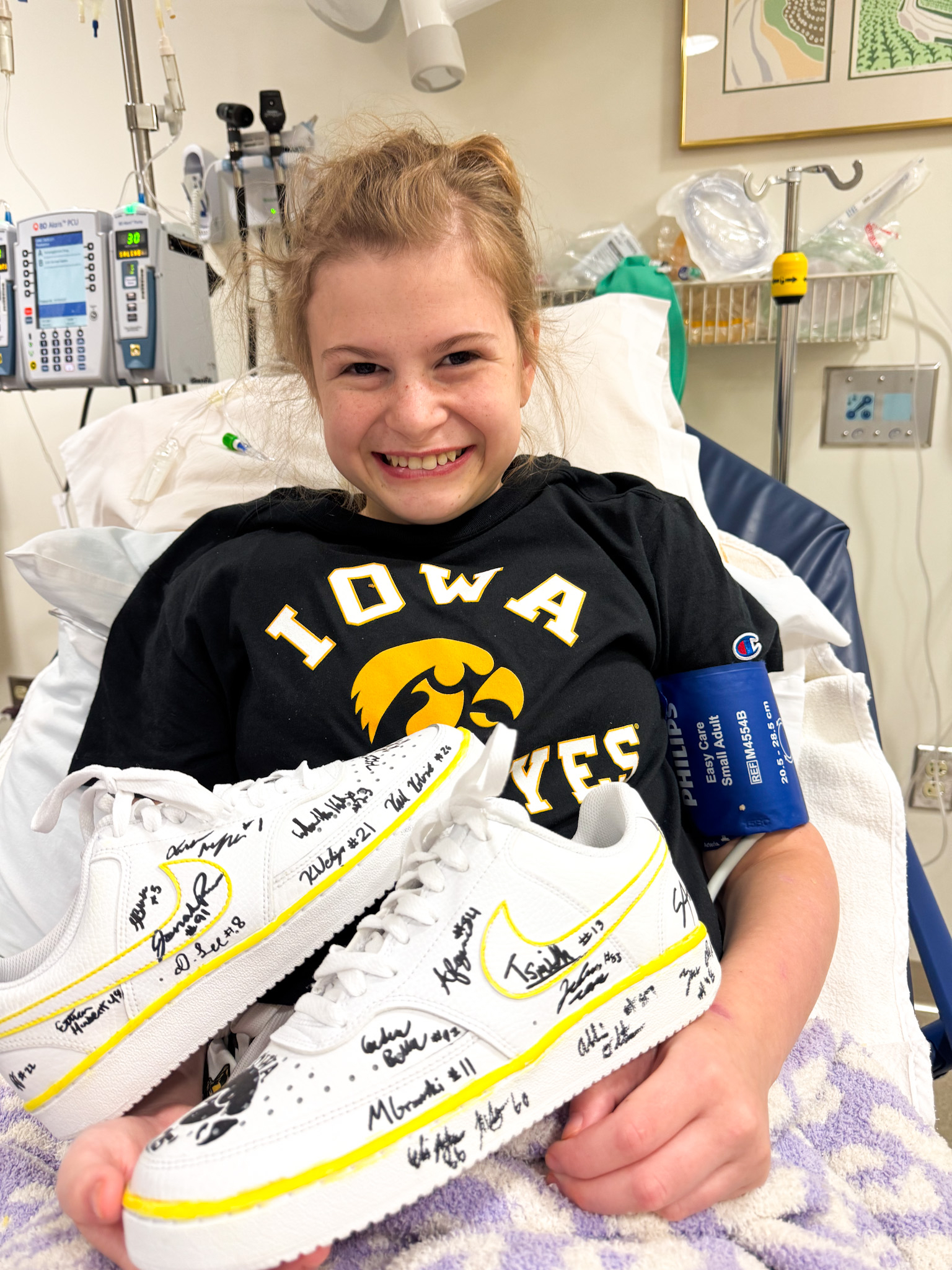 In an example of how the care provided by the CRU team goes far beyond their clinical expertise, Clubb leaned on her personal connection with UI football player Kaden Wetjen to secure a pair of Nike shoes for Gianna signed by Wetjen and his teammates from the Iowa Football team. Gianna was also the guest of honor at a recent Iowa Women’s Soccer game.
